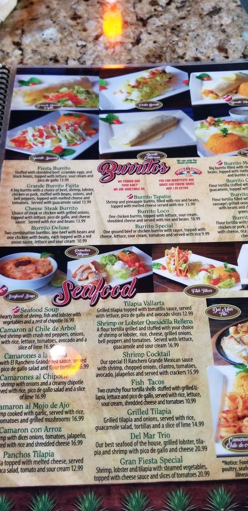 Beef strips, chicken or pork with El Ranchero Grande mild red sauce. Served with rice, beans and flour tortillas